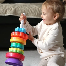 Stavanie veže z krúžkov rôznej veľkosti a farby rozvíja logické myslenie a kreativitu.