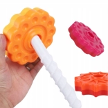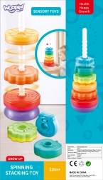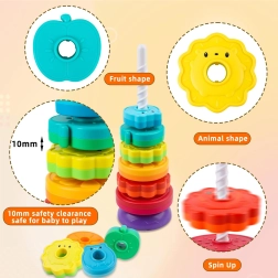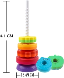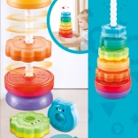 - Sada obsahuje šesť krúžkov rôznych tvarov, ktoré možno skladať na seba a vytvoriť farebnú, točiacu sa pyramídu