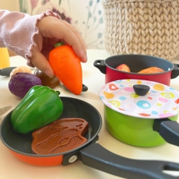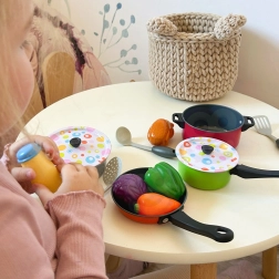 Hrnce s pokrievkami, panvička a farebné suroviny umožnia deťom napodobniť skutočné varenie a rozvíjať fantáziu aj jemnú motoriku.