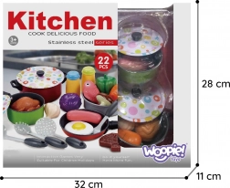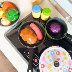 So setom WOOPIE získa vaše dieťa vlastnú kuchynku v malom: hrnce s pokrievkami, panvičku, misku, korenie aj bohatý výber potravín od vajíčka a klobásky po rybu, zeleninu či steak. Vďaka realistickému prevedeniu a živým farbám rozvíja predstavivosť, jemnú motoriku aj sociálne zručnosti pri hre na varenie.