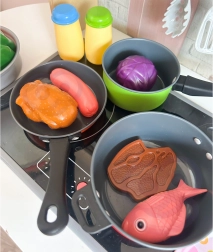 - Hrnček s pokrievkou, rajnica s pokrievkou, panvička, miska, cedník/naberačka, lyžica na cestoviny, špachtľa, kuchárska lyžica, soľnička a korenička, plastové potraviny (cesnak, ryba, zelená paprika, mrkva, huba, kapusta, klobása, vajíčko, steak, kurča)