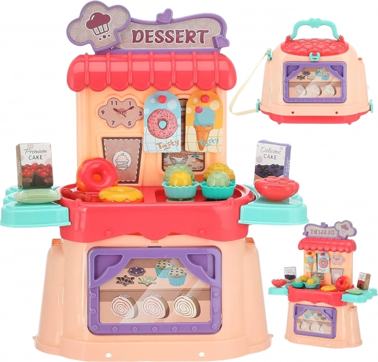 Táto farebná sada prináša deťom svet sladkostí – od donutov a cupcakeov po zmrzlinu – a zároveň praktickú konštrukciu, ktorá sa počas chvíľky premení z kompaktného kufríka na plnohodnotný pultík. Vďaka ramennému popruhu ju deti pohodlne prenesú a môžu si otvoriť vlastnú mini cukráreň kdekoľvek.