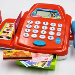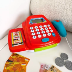 Ručný skener vydáva realistické zvuky. Deti môžu platiť mincami, bankovkami aj kartou – rovnako ako v skutočnom obchode.