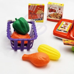 Súčasťou je nákupný košík a plastové potraviny (zelenina, ovocie, pochutiny), ktoré podporujú fantáziu a sociálne zručnosti.