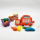 - Pokladňa so skenerom, nákupný košík, plastové potraviny, mince, bankovky, platobné karty