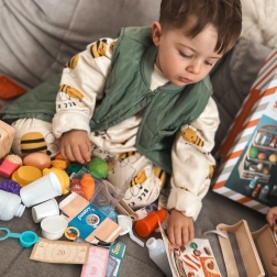 Hra na obchod podporuje samostatné myslenie, komunikáciu a tvorivú hru. Vďaka 42 prvkom – od ovocia a zeleniny po nápoje a konzervy – si deti môžu vytvárať vlastné scenáre a precvičovať každodenné situácie.