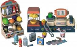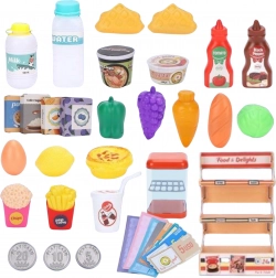 Sada obsahuje ovocie, zeleninu, nápoje, konzervy, bankovky aj mince – všetko pre dlhé hodiny kreatívnej hry v obchode.