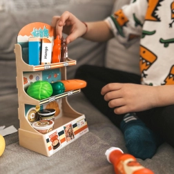 Prehľadné police s kategóriami a stolná váha učia deti triediť produkty, vážiť ovocie a zeleninu a obsluhovať zákazníkov.