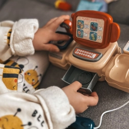 Deti môžu „pípať“ tovar a počuť autentické zvuky skenovania. Zásuvka na peniaze a tlačidlá podporujú realistickú hru a učenie o platbe.