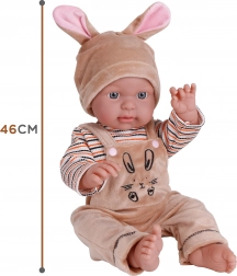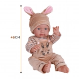 Táto realistická bábika bábätko v zajačikovskom oblečku je stvorená pre láskyplné hranie. Oblečok s kapucňou s uškami, body s roztomilým motívom a mäkké čižmičky vytvárajú nežný vzhľad, ktorý deti milujú. Vďaka pohyblivým končatinám môžete bábiku ľahko posadiť aj postaviť, čo rozširuje možnosti hry.