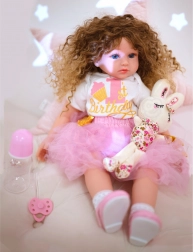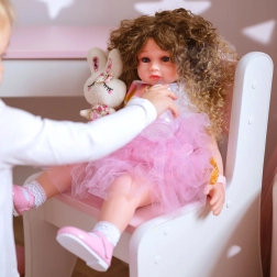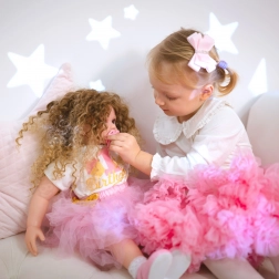 Jemné riasy, výrazné oči a dlhé vlasy na česanie podporujú kreativitu. Plyšové bruško a mäkké silikónové končatiny dodávajú bábike prirodzený dotyk.