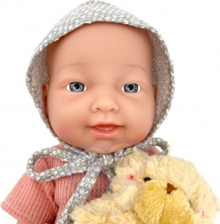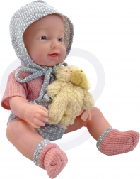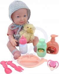 Set obsahuje všetko, čo malí opatrovatelia potrebujú: oblečenú bábiku, cumlík, medvedíka, fľaštičku a jedálenskú sadu (tanierik, vidličku, lyžičku), doplnenú o dve fľaše „kozmetiky“ pre kúpeľové a ošetrujúce scenáre. Bábika má mäkké, gumové pohyblivé končatiny a plastové telíčko bez plyšovej výplne.
