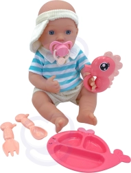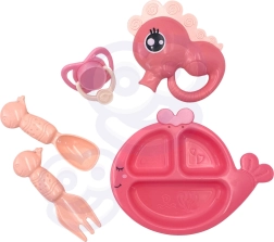 Súprava obsahuje delený tanierik, príbory, cumlík so šnúrkou a ďalšie doplnky, ktoré premenia hru na skutočnú starostlivosť.