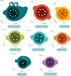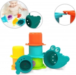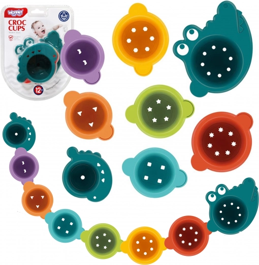 Tégliky možno skladať do seba, stavať do vysokej veže alebo ich spájať bokom do dlhého „chvosta“. Jeden z téglikov má rozkošný vzhľad krokodíla, ktorý dodá kúpeľu ďalšiu porciu zábavy. Farebné prevedenie a tvary otvorov pomáhajú s učením farieb a geometrických tvarov.
