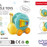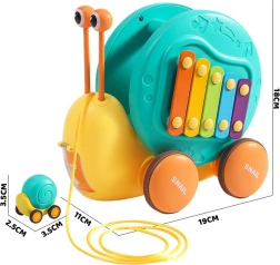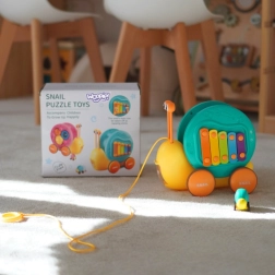 Tento multifunkčný slimák od značky WOOPIE zaujme deti na prvý pohľad. Farebná ulita slúži ako xylofón s klávesmi, do ktorých možno ťukať vyberateľnými „očkami“ – paličkami. Vďaka odolnej šnúrke môžu deti slimáka ťahať aj postrkovať, a rozvíjať tak koordináciu oko–ruka aj rovnováhu. Na chrbte je umiestnené tlačidlo, ktoré otvorí vystreľovaciu dráhu pre malé autíčko–slimáka a postará sa o množstvo radostných momentov.