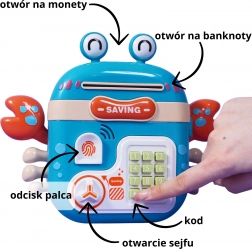 Pri stlačení číslic krab vyslovuje čísla v angličtine a prehráva melódie. Deti sa učia rozpoznávať čísla a zároveň si užívajú zábavu pri zadávaní PIN kódu.