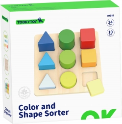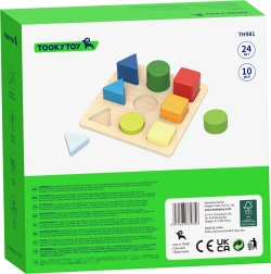 Drevená skladačka od značky TOOKY TOY učí deti rozpoznávať tvary a farby a rozvíja jemnú motoriku, logické myslenie aj koordináciu oko–ruka. Dieťa vkladá 9 farebných dielikov – trojuholníky, štvorce a kruhy – do správnych otvorov v tabuľke. Skvelá zábava i tréning pamäti a koncentrácie pre najmenších.