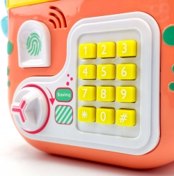 Ukladajte mince a bankovky cez samostatné otvory, nastavte heslo a otvorte pomocou otočného kolieska. Ideálne pre prvé kroky k finančnej gramotnosti.