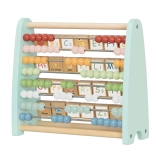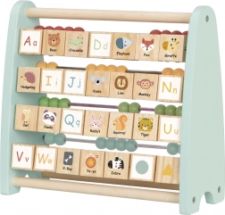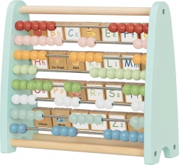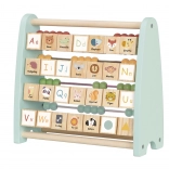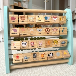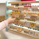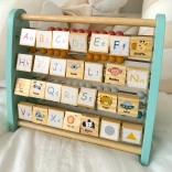 Jedna strana obsahuje klasické počítadlo s korálkami pre počítanie, druhá strana má otočné bloky s písmenami abecedy a obrázkami pre interaktívne učenie.