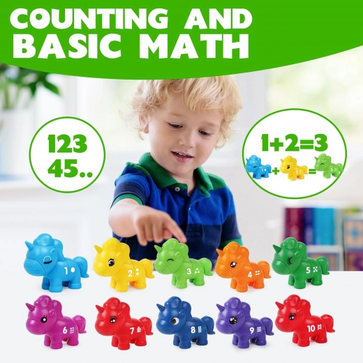 Každý jednorožec má číslo, ktoré pomáha deťom učiť sa počítanie pri hre.