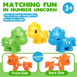 Vzdelávacia hračka Dopasuj Cyferki prenesie va16e dieťa do magického sveta jednorožcov, kde môže spájať časti podľa farieb, čísel alebo tvarov. Táto zábavná a rozvíjajúca hra stimuluje manuálne zručnosti, pozorovacie schopnosti a logické myslenie dieťaťa.