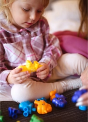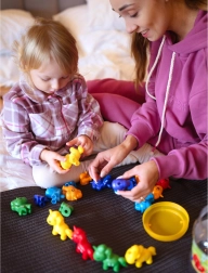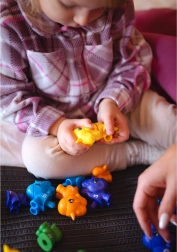 Dieťa a rodič môžu spolu hrať s pestrými, spájateľnými plastovými hračkami v tvare jednorožcov, čo podporuje rozvoj koordinačných zručností.