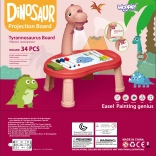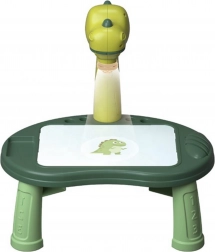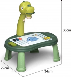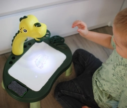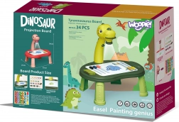 Detský projekčný stolík v tvare dinosaura od značky WOOPIE premieta obrázky na plochu pre ľahké obkresľovanie. Obsahuje projektor, 24 predlôh (3 disky), sucho stierateľnú tabuľu, 5 fixiek a 2 doskové hry (Človeče, nehnevaj sa! a Hady a rebríky). Ideálny na rozvoj kreativity a jemnej motoriky detí od 3 rokov.