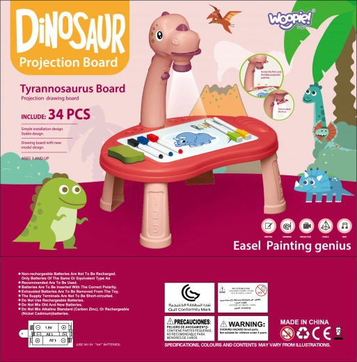 Detský projekčný stolík v tvare dinosaura od značky WOOPIE premieta obrázky na plochu pre ľahké obkresľovanie. Obsahuje projektor, 24 predlôh (3 disky), sucho stierateľnú tabuľu, 5 fixiek a 2 doskové hry (Človeče, nehnevaj sa! a Hady a rebríky). Ideálny na rozvoj kreativity a jemnej motoriky detí od 3 rokov.