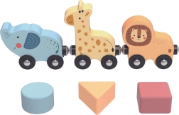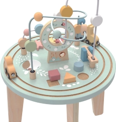Tento kvalitný drevený stolík prináša deťom pestrý svet tvarov a farieb. Dvojstopový motorický labyrint trénuje obratnosť prstov, triedička tvarov učí spoznávať tvary a farby, ozubené kolieska rozvíjajú logiku a príčinné súvislosti a vláčik s roztomilými zvieratkami obchádza trasu okolo stolíka.