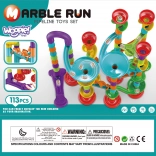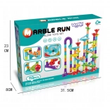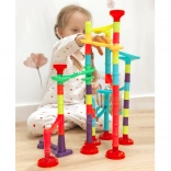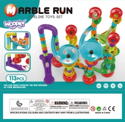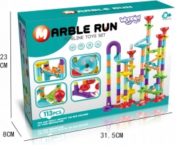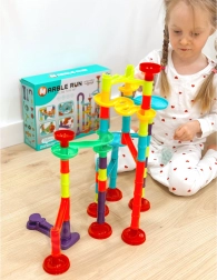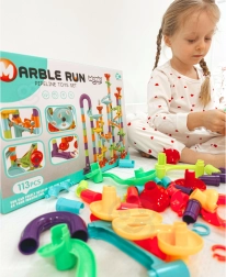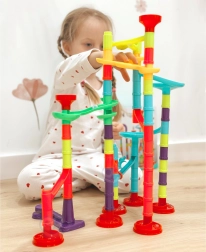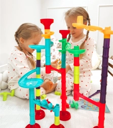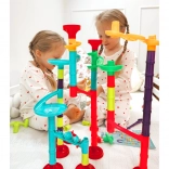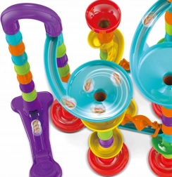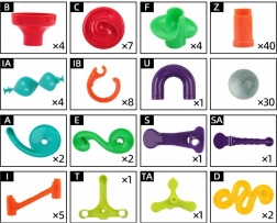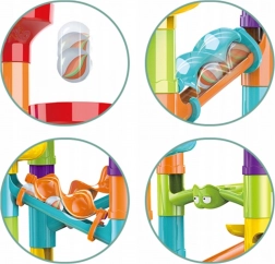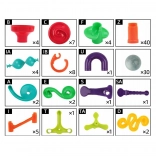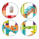 Rôzne trubice, zákruty, špirály, lieviky a stĺpiky umožnia postaviť vždy novú a zábavnú guličkovú dráhu. Stavajte podľa návodu alebo tvorte vlastné nápadité trasy.