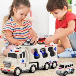 Tento interaktívny záchranársky set prináša deťom svet skutočných zásahov: veľká transportná sanitka/ťahač odvezie a uskladní celú jednotku – hasičské vozidlo, policajné auto, policajný vrtuľník a sanitku. Stlačením tlačidla hore na kabíne sa spustia svetelné efekty a sirény, ktoré ešte viac vtiahnu do hry.