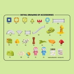 Zostava obsahuje 104 dielikov, vrátane rôznych kociek, figúrok, plochých kociek, návodu a samolepiek s obrázkami.