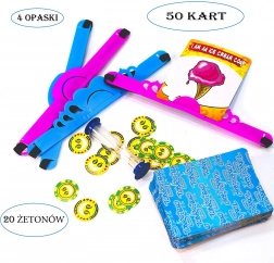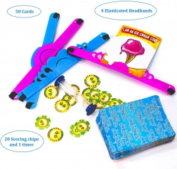 50 kariet, 4 čelenky, 20 žetónov, 1 pieskové hodiny
