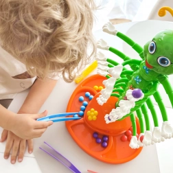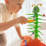 Deti používajú pinzety na presné pokladanie guličiek na pohybujúce sa ručky húsenice, čím prirodzene rozvíjajú koordináciu oko–ruka a trpezlivosť.