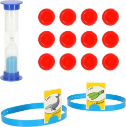 Odolné čelenky držia kartu pohodlne na hlave, presýpacie hodiny dodajú kolám tempo a žetóny pomôžu so skóre. Ideálna sada na svižnú a napínavú hru vo dvojici.