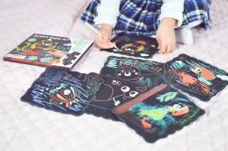 Šesť rôznych kariet s mačkou, psom, slimákom, králikom, rybkou a papagájom motivuje deti k tvoreniu a objavovaniu skrytých farieb.