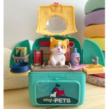 Po otvorení vznikne herná stanica s drezom, kohútikom, poličkami a závesmi na doplnky. Deti môžu mačičku kúpať, česať aj kŕmiť a prežívať realistické situácie.