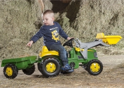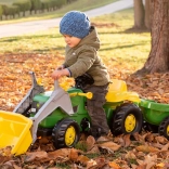 Detský šliapací traktor JOHN DEERE RollyKid so zdvíhacou prednou lyžicou a odnímateľným prívesom prináša hodiny aktívnej zábavy na záhrade aj na ihrisku. Robustná konštrukcia, zabudovaný mechanický systém pre vyššiu bezpečnosť, otváracia kapota s úložným priestorom a reťazový prevod pre plynulú jazdu robia z tohto traktora skvelú voľbu pre deti od 3 rokov.