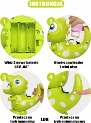 Detská bublifuk v tvare dinosaura od značky WOOPIE je skvelá hračka pre deti. Dinosaurus má pohyblivú čeľusť a použitím tlačidla otvára ústa. Vystrelené bubliny sú nielenže vypúšťané veľkou frekvenciou, ale nainštalovaný ventilátor ich fúka ešte ďalej. Hračku môžeme zapnúť podržaním tlačidla (manuálny režim), a posunutím prepínača ju môžeme nechať zapnutú stále (automatický režim). Dinosaurus obsahuje svetelné efekty (blikajú farby počas používania hračky) a zvukové efekty (veselé melódie a zvuky). Dodatočne v balení nájdeme nádobku na roztok na bubliny. Hračka je ideálna na zábavu vonku aj vo vnútri.