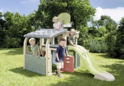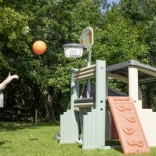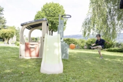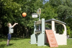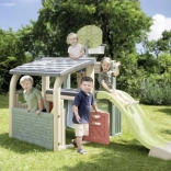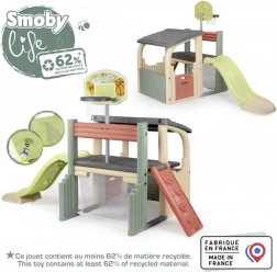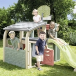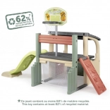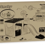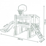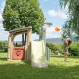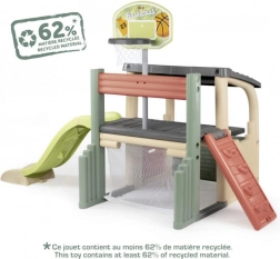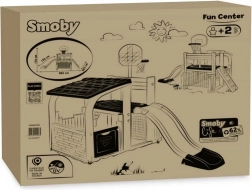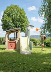 Multifunkčné herné centrum SMOBY spája šport, kreatívnu hru aj oddych. Deti môžu strieľať na basketbalový kôš, trénovať presnosť pri futbalovej bránke, posilňovať koordináciu na lezeckej stene a vyblázniť sa na 150 cm šmýkačke. Nechýba zastrešený domček s dvierkami na pokojné chvíľky a imaginatívnu hru.