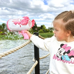 Vďaka premyslenému mechanizmu pištoľ rovnomerne rozvádza roztok do všetkých otvorov a zaisťuje bohatý bublinový efekt. Praktická podložka na roztok uľahčí namáčanie nástavca. Súčasťou je tiež akumulátor s USB nabíjaním a 2 náplne, aby ste mohli začať hneď po vybalení.