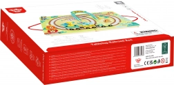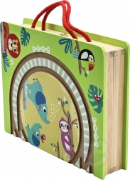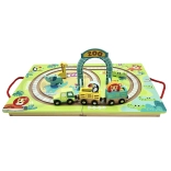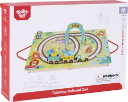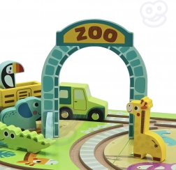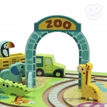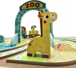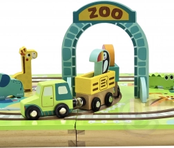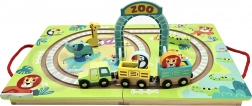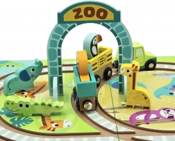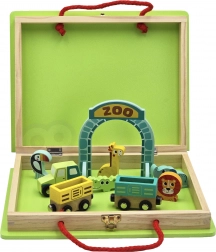 - Obsah sady: drevené koľaje v podobe kufríka, lokomotíva a vagóniky na magnet, 5 figúrok zvierat, skladacia brána ZOO