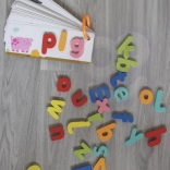 Obsahuje 57 dielov: 26 písmenkových dielikov, 30 pevných kariet a detský krúžok na spojenie kariet. Všetko je vyrobené z kvalitných, netoxických materiálov v jemnej, púdrovej palete. Hladké hrany a bezpečné farby zaručujú pokoj pri hraní. Ideálne na domáce učenie aj ako doplnok do škôlok.
