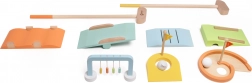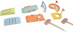 Súčasťou setu sú 2 golfové palice, 2 loptičky, 2 jamky s vlajočkami a 5 originálnych prekážok, s ktorými si deti vytvárajú vlastné trate. Hra podporuje spoluprácu, trpezlivosť a pohybovú aktivitu.