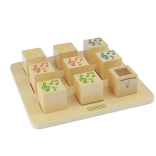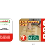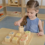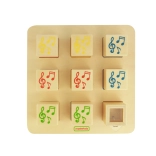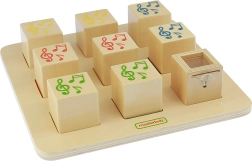 Set obsahuje dosku a osem drevených kociek, ktoré pri zatrasení vydávajú rôzne zvuky. Úlohou dieťaťa je nájsť správne dvojice podľa zvukov.