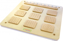 Táto drevená zmyslová tabuľa ponúka deťom bezpečné a podnetné prostredie na spoznávanie sveta dotykom. Hra spočíva v tom, že dieťa so zatvorenými očami najprv preskúma malú textúrovanú dlaždicu a následne hľadá jej zhodu medzi deviatimi väčšími. Týmto prirodzeným spôsobom posilňuje zmyslovú integráciu, sústredenie a schopnosť porovnávania.