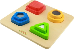 Tento drevený Montessori sorter kombinuje niekoľko vzdelávacích aktivít v jednej hre. Dieťa najprv vkladá farebné geometrické tvary do správnych otvorov v doske a následne ich páruje podľa tvaru, farby aj textúry. Vďaka tomu prirodzene trénuje logické myslenie, koordináciu oko–ruka a hmatové vnímanie.