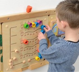 Tabuľa umožňuje deťom interaktívne zapojenie a predstavuje 5 spôsobov znázornenia čísel od 1 do 5, ako sú číslice, prsty, čiary, bloky a bodky. Na ľavej strane nájdete posúvače umožňujúce nastavenie rôznych výziev.