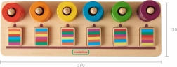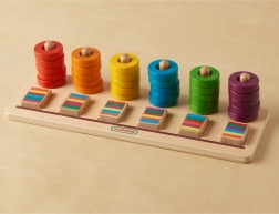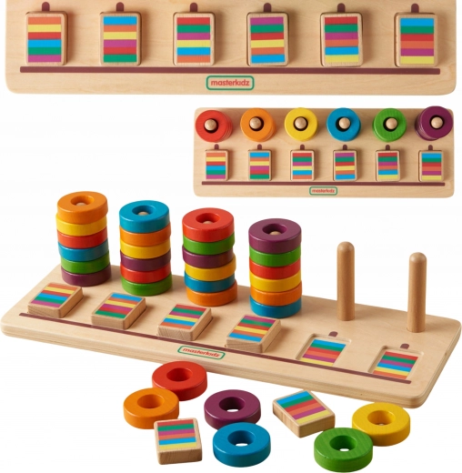 Táto vzdelávacia tabuľa je perfektnou skladačkou pre deti od 2 rokov. Tento set obsahuje 30 farebných krúžkov (6 sád po 5 kusoch v podobnej farbe), ktoré možno využiť na hru, učenie farieb, triedenie a sekvencovanie. Deti môžu zoskladať krúžky v určenom poradí alebo vytvárať vlastné sekvencie. Priestory pred tyčami umožňujú skladanie blokov sekvencií, čo predstavuje výzvu a rozvíja koncentráciu, priestorové uvedomenie, logické myslenie a schopnosť rozpoznávania farieb.