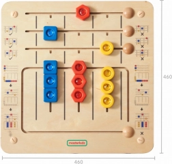Táto vzdelávacia tabuľa je navrhnutá tak, aby podporovala rozpoznávanie tvarov a jemnú motoriku. Je rozdelená na dve časti: horná časť obsahuje úlohový pásik, kde deti musia umiestniť tri tvary (červený šesťuholník, modrý štvorec a žltý kruh) na správne miesta. Dolná časť tabule obsahuje tri stĺpce s 9 tvarmi, ktoré deti musia správne priradiť podľa farby a tvaru. Prvky sú umiestnené tak, aby sa dali ľahko presúvať, ale nedali sa stratiť. Tabuľu možno použiť na stole alebo ju pripevniť na stenu.